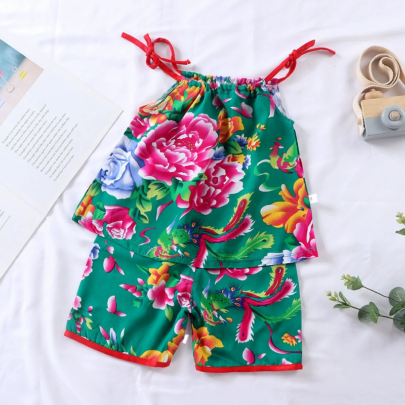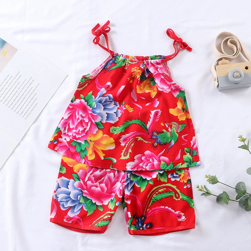 Children's vest set for boys and girls, cotton silk pajamas, home clothes, baby Northeast large flower suspender shorts two-piece set