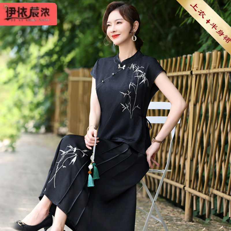 Chinese Short-sleeved T-shirt suit Mother Suit Summer New Middle-aged and Elderly Women's Skirt Satin Shirt Two-piece Set for Women