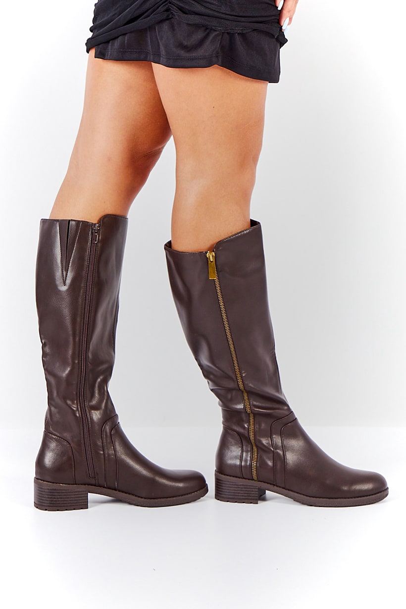 | descriptionOriginal | Heel Height : 1" / 2.5 cm, Heel Style : Block heel, Ideal For : Women, Shoe Closure : Zipper closure, Shoe Width : Medium, Sole Material : Synthetic sole, Style : Knee-length boot, Toe Style : Round toe, Disclaimer : Product color may slightly vary due to photographic lighting sources or your monitor settings., Occasion : Casual, Shoe Material : Synthetic Leather, Color Family : Brown, |
