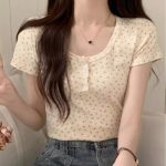 قميص نسائي قصير بأكمام قصيرة وياقة زهرية لصيف 2024 قميص جديد بتصميم نحيف