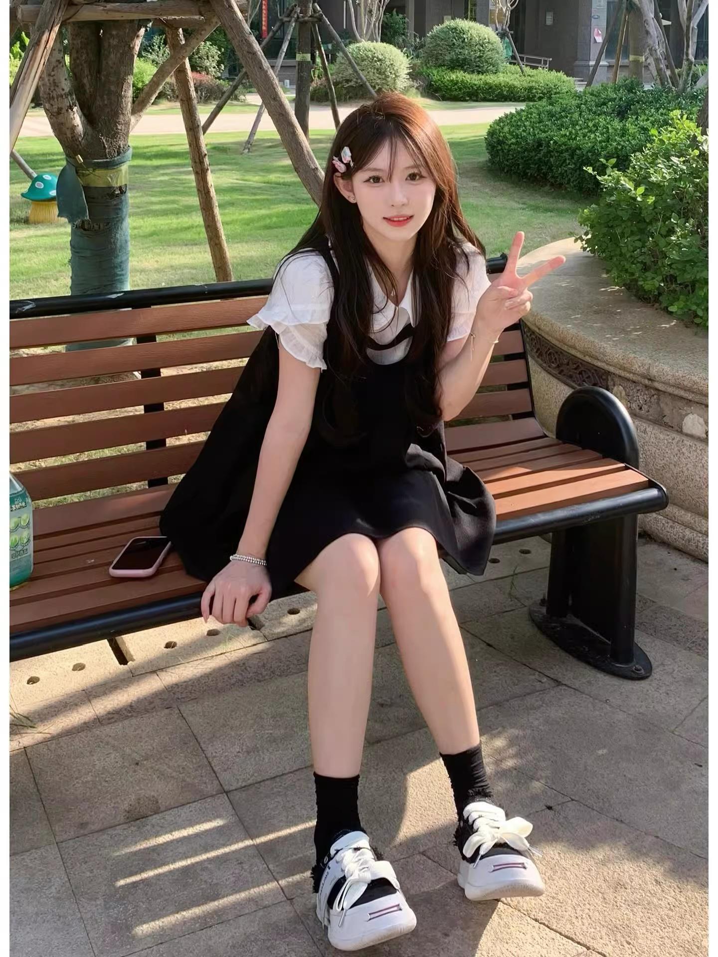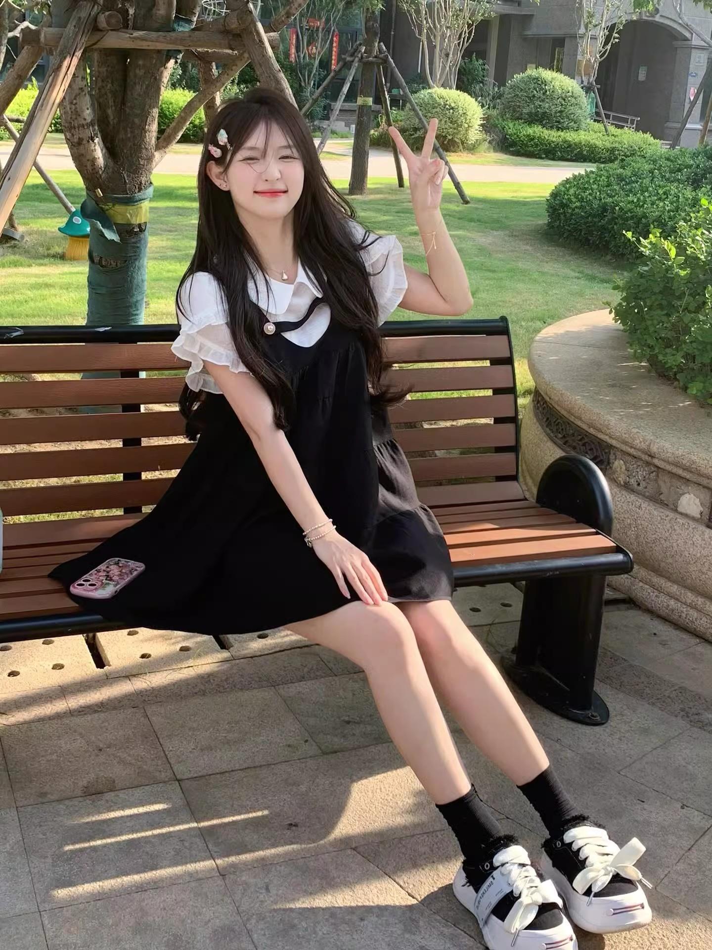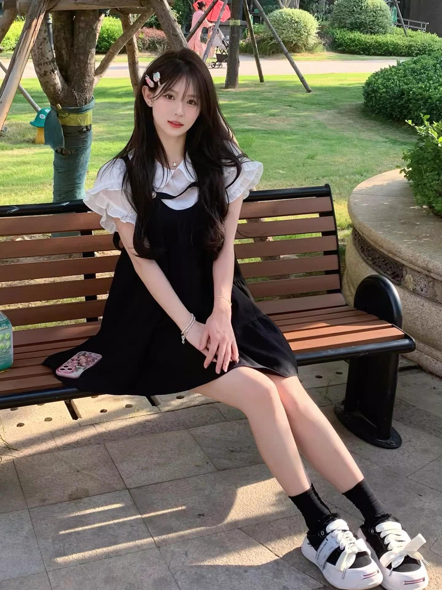 ملابس صيفية صغيرة على طراز الكلية فستان أسود فضفاض جديد مكون من قطعتين بياقة الدمية