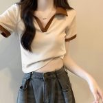 | nameOriginal | Colorblock Polo Collar Short-sleeved T-shirt Women's 2023 Summer New Slimming V-neck Niche Short Design Top |