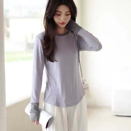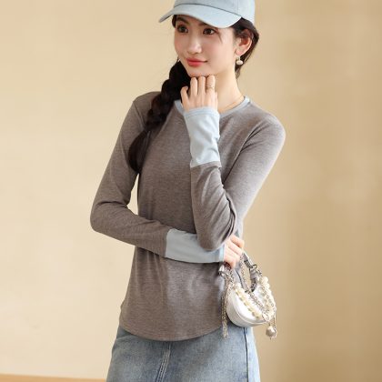 Contrast Color Crewneck Base Shirt Women's 2024 Spring New Arc Design Tight Waist Top with Slimming Long-sleeved T-shirt