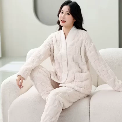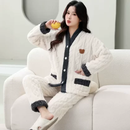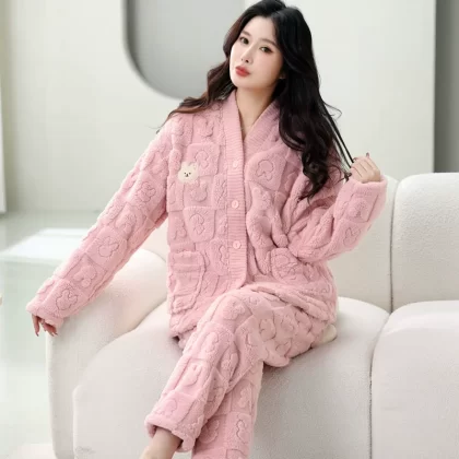 بيجامة مخملية مرجانية للسيدات للربيع والخريف والشتاء سميكة بالإضافة إلى بدلة منزلية بأكمام طويلة مخملية لطيفة على طراز الأميرة فلانج