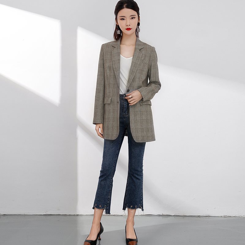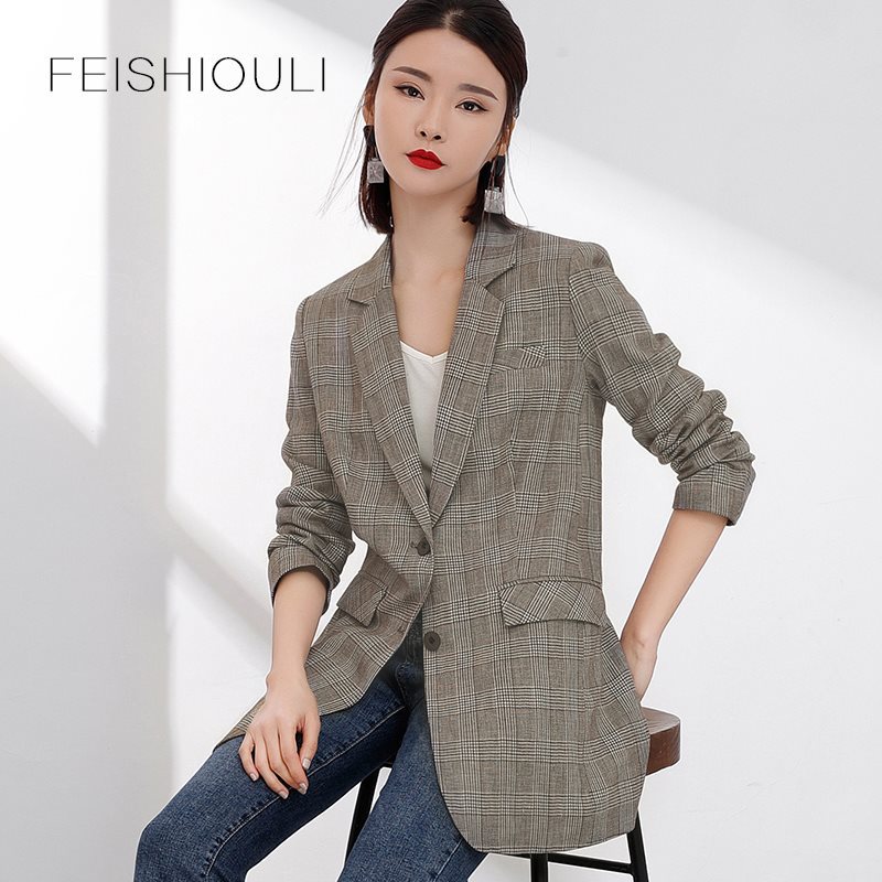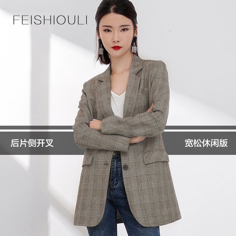 Cotton and Linen Suit Jacket Women's Spring and Autumn New Retro Plaid Large Size Mid-length Casual Linen Small Suit Slimming