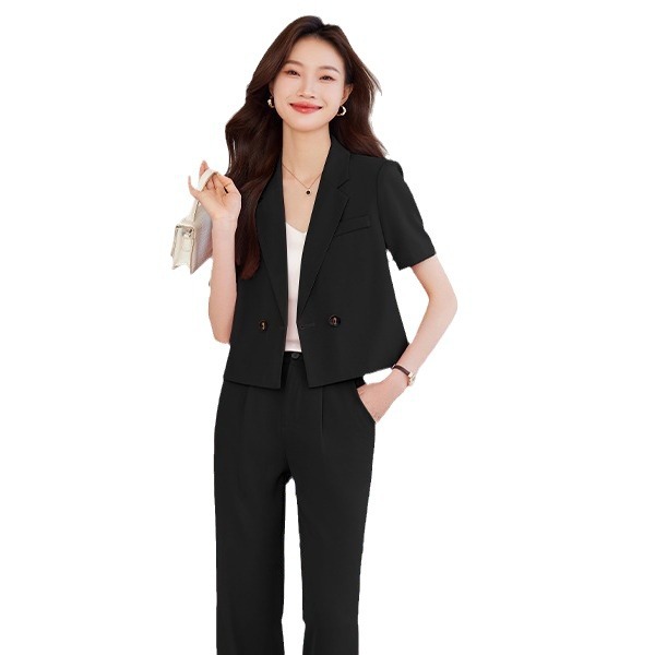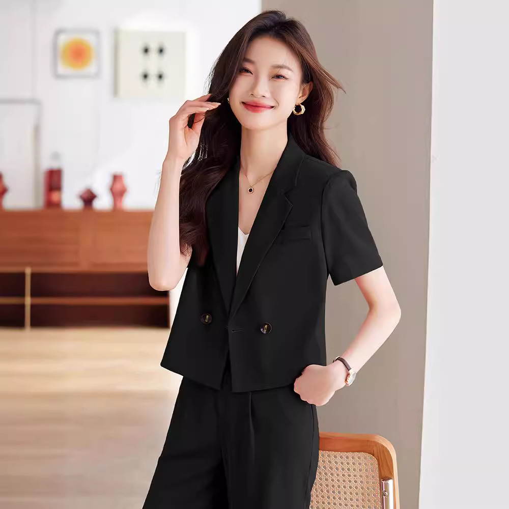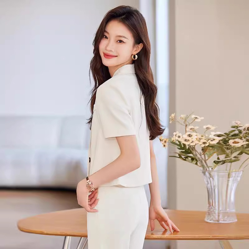 creamy-white Short Small Suit Jacket Women's New Korean Style Petite Age-reducing Double-breasted All-match Suit Two-piece Set
