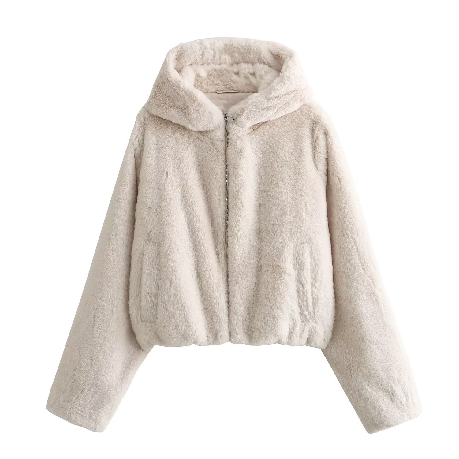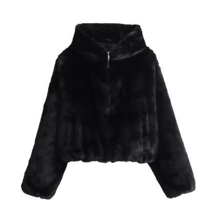 Cross Border AliExpress Women's Clothing Wholesale All Match Hooded Zipper Long Sleeve Faux Fur Jacket Coat Solid Color Top