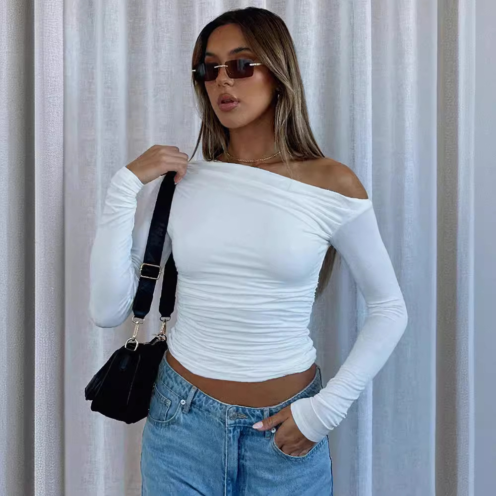 Cross-border Amazon European and American women's shoulder asymmetric solid color navel top long sleeve Sexy Slim temperament T-shirt