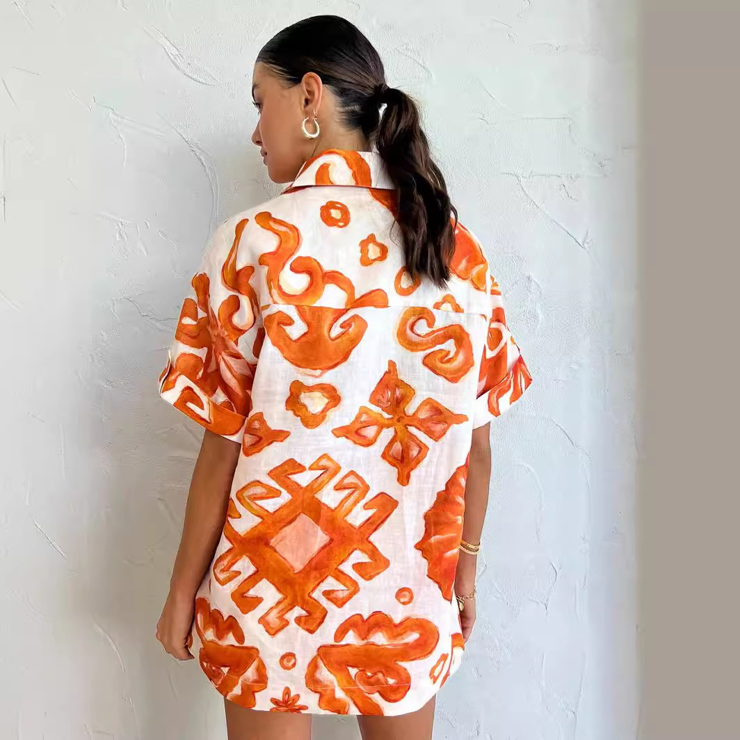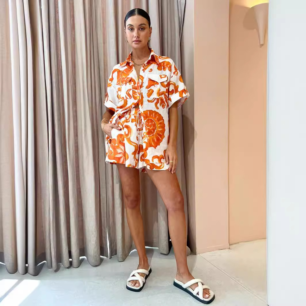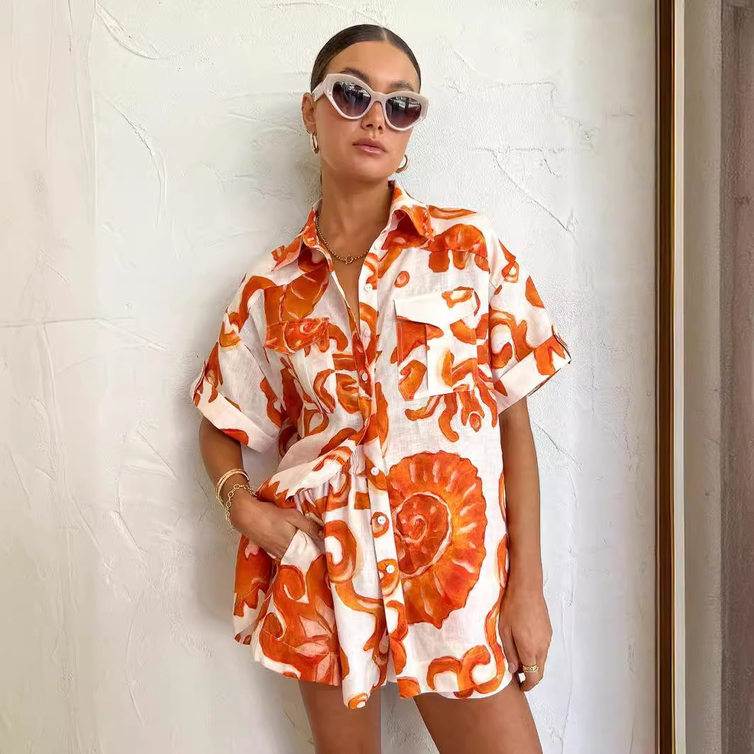 | nameOriginal | Cross-border Amazon Independent Station 2023 European and American Summer Printed Shorts Lapel Loose Women's Shirt Casual Set |