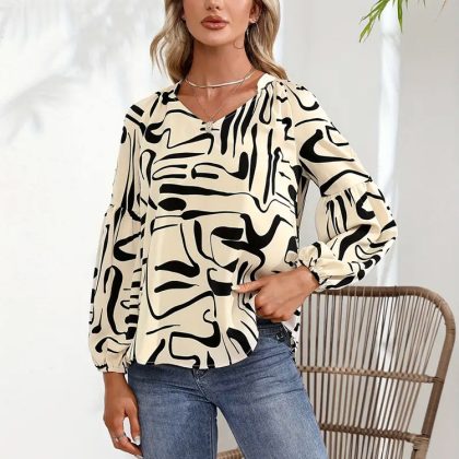 Cross-border Amazon new 2024 Summer new irregular printed V-neck T-shirt commuter loose long-sleeved top for women