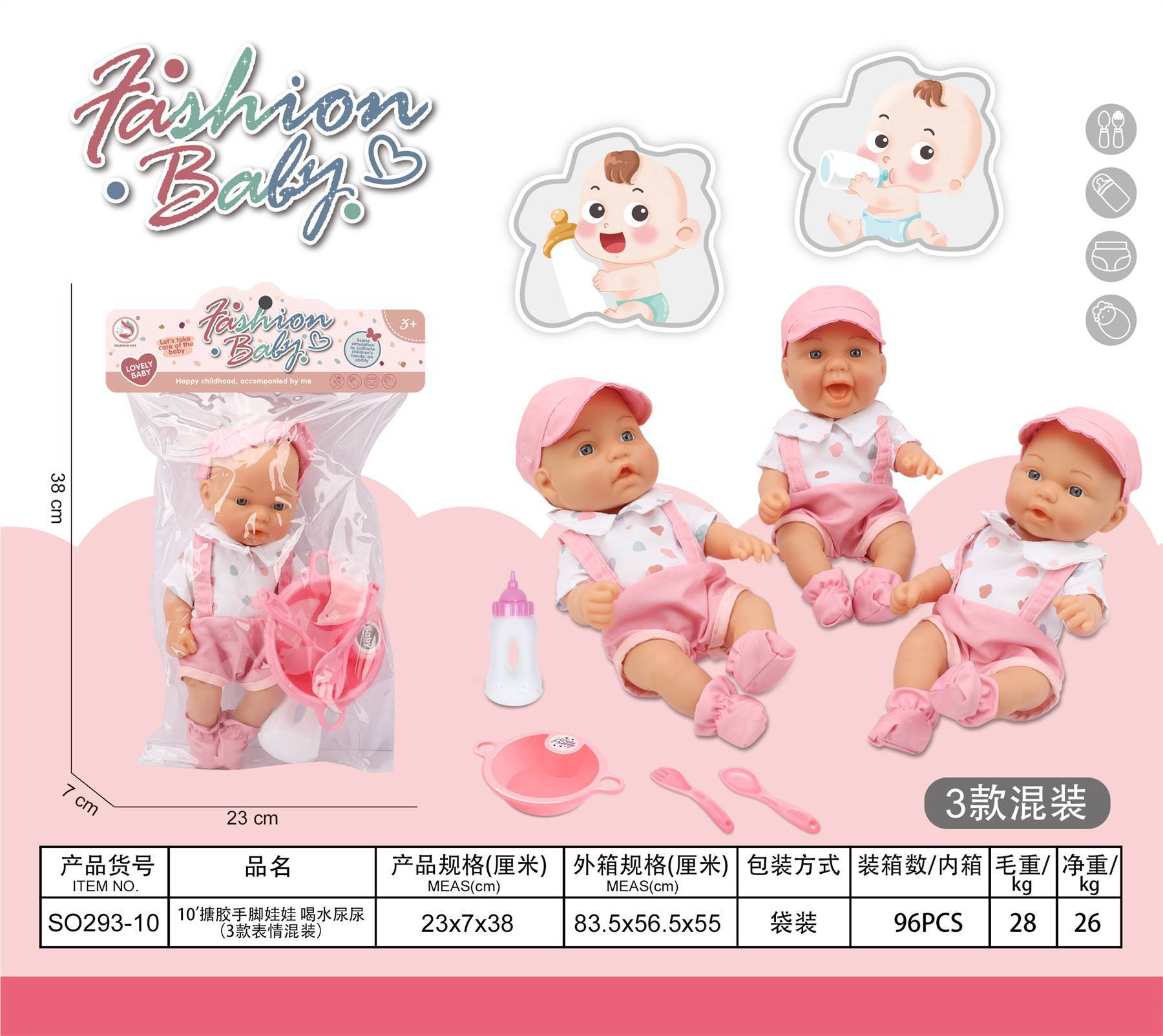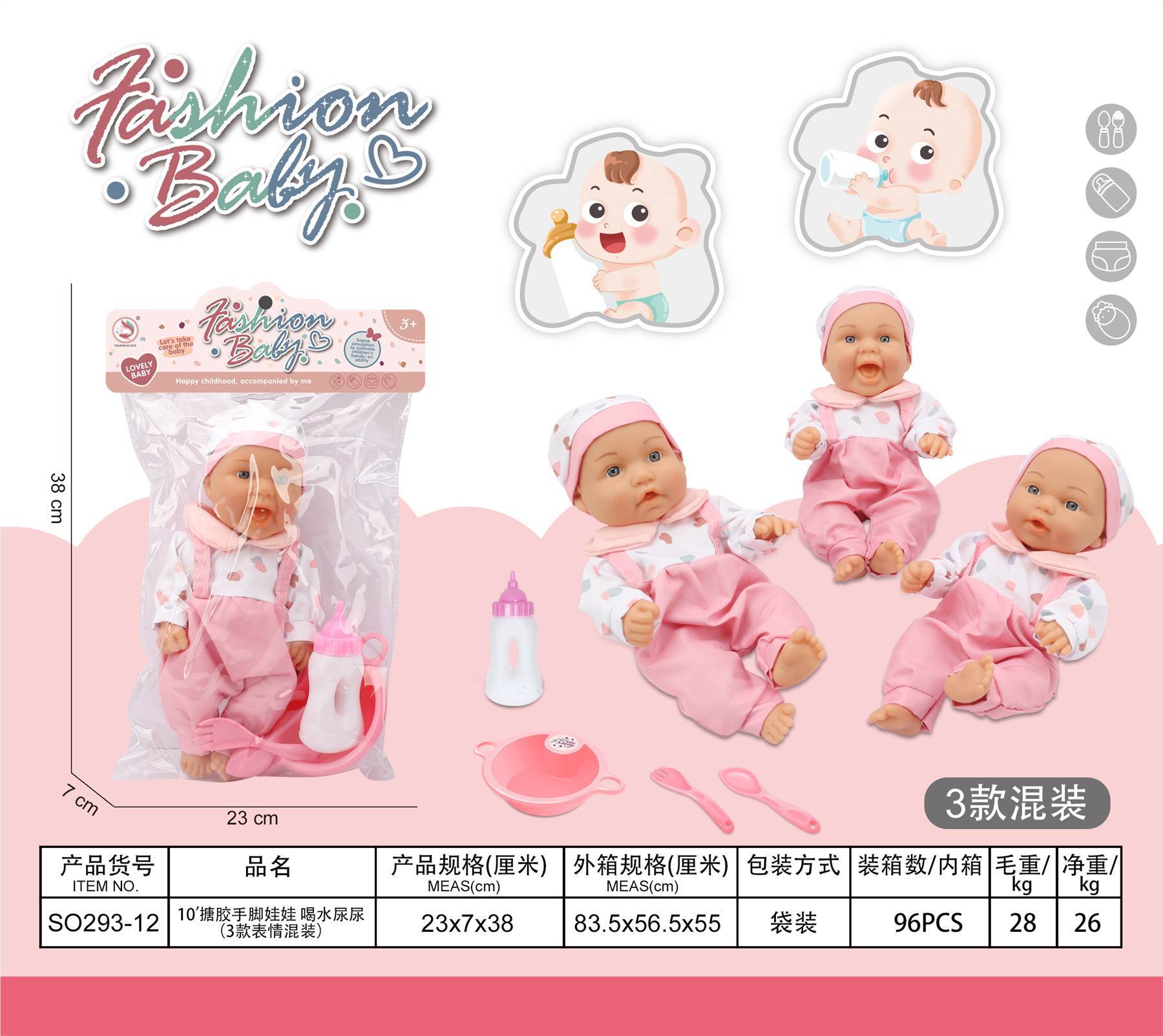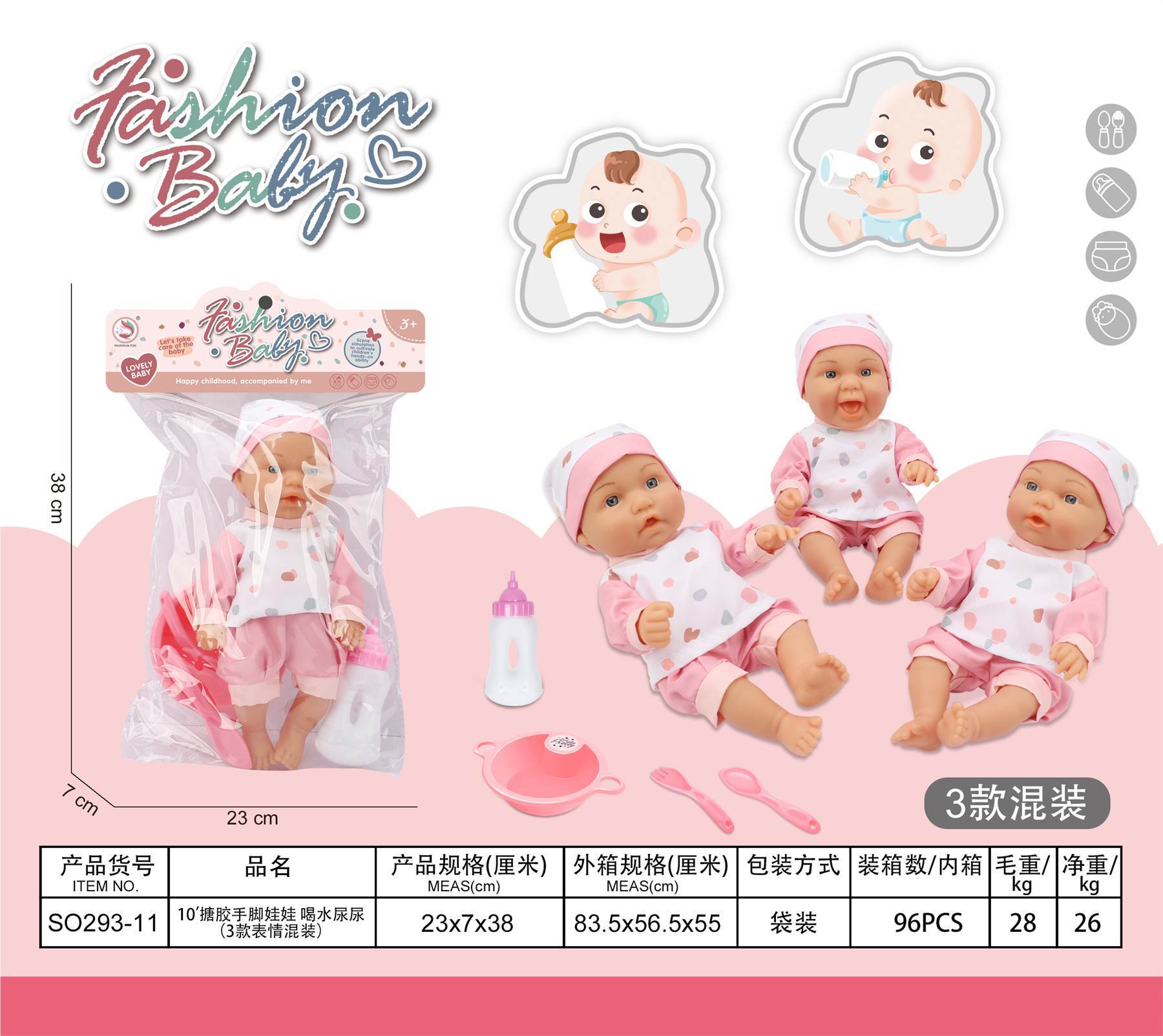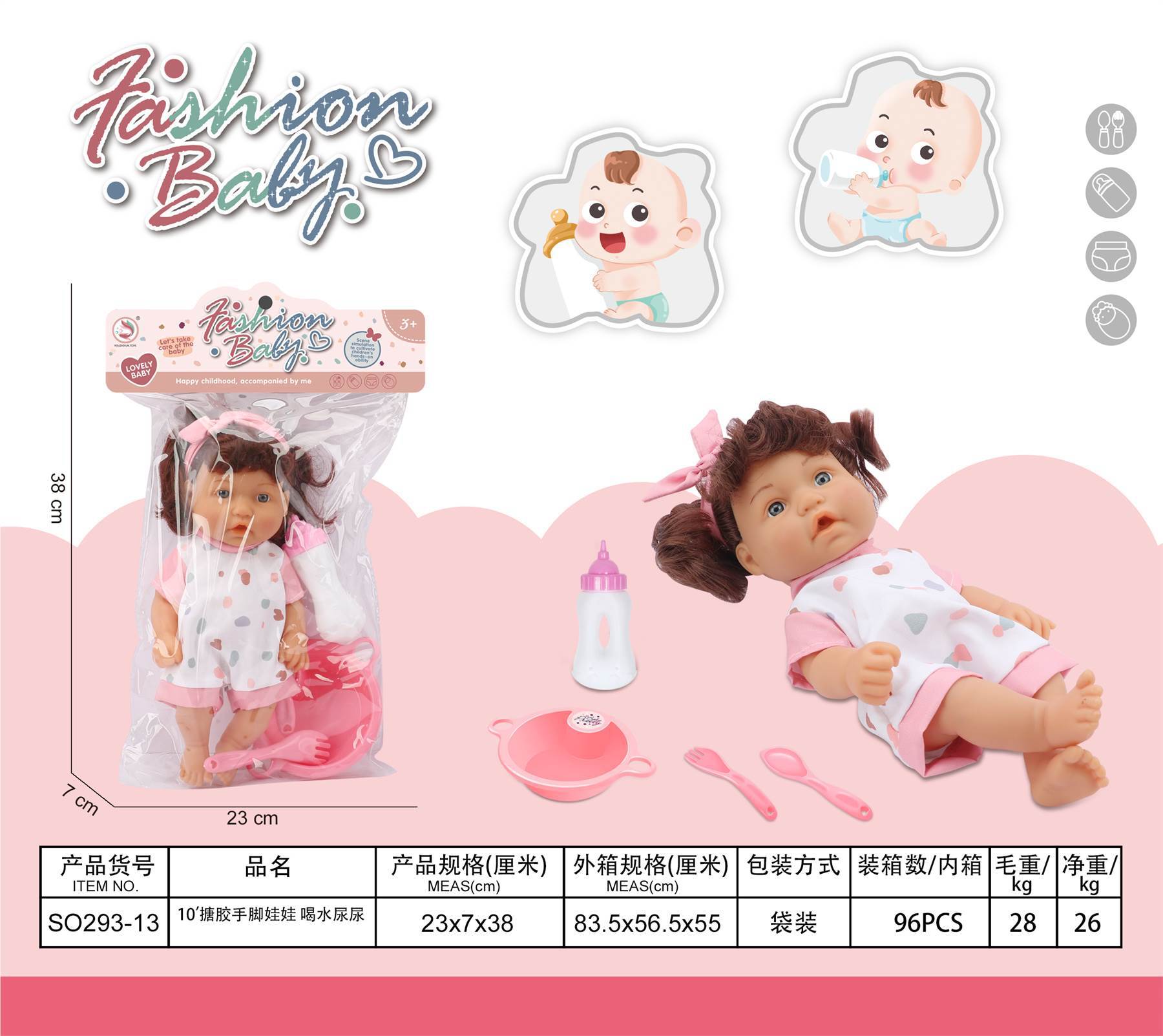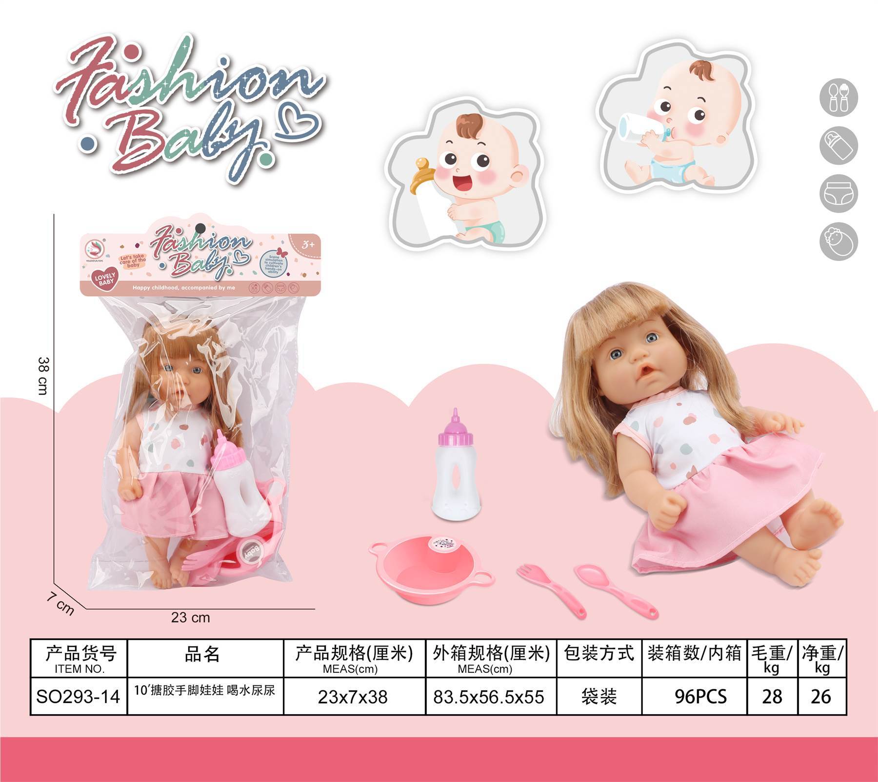| nameOriginal | Cross-border children's 10-inch vinyl hand-foot figure doll drinking water urine function with bottle dinner plate play house toy |