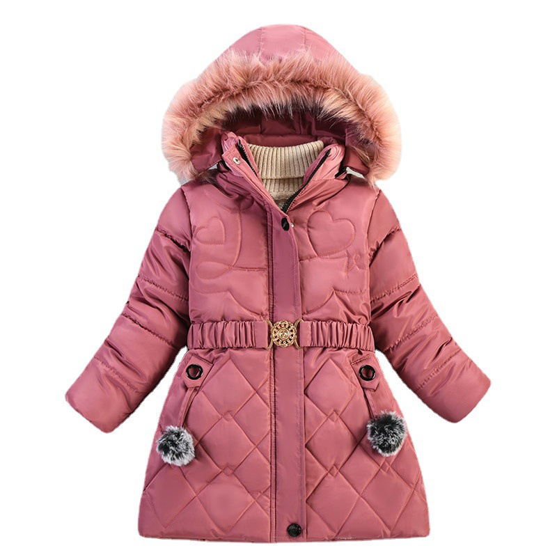 ملابس أطفال عبر الحدود شتوية على الموضة الكورية للفتيات المعين سترة مبطنة بالقطن معطف طويل بياقة صوف بقلنسوة سترة مبطنة بالقطن