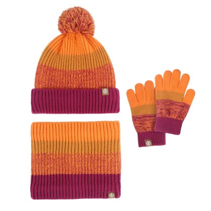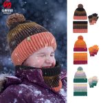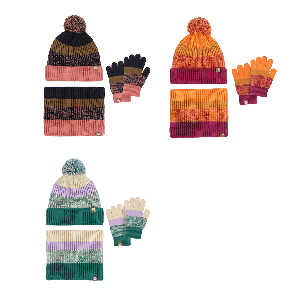 طقم وشاح للأطفال عبر الحدود مكون من ثلاث قطع مبطن بالصوف بألوان متباينة وقبعة كروية من الفرو وقفازات من ثلاث قطع مزيج من الصوف الدافئ