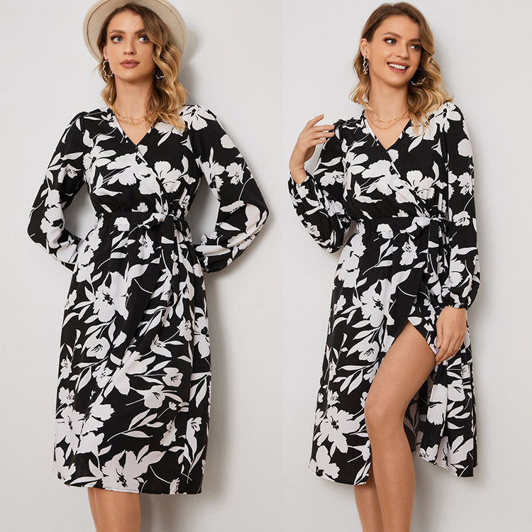 | nameOriginal | Cross-border Foreign Trade AliExpress Amazon Europe and America 2023 Spring and Summer Long Sleeve Split V-Neck Lace-up Waist Dress for Women |