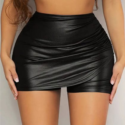 Cross-border Foreign Trade Black Asymmetric High-waist High-elastic Pants Skirt Women's High-end Tight Sexy Hip Leather Pants Shorts