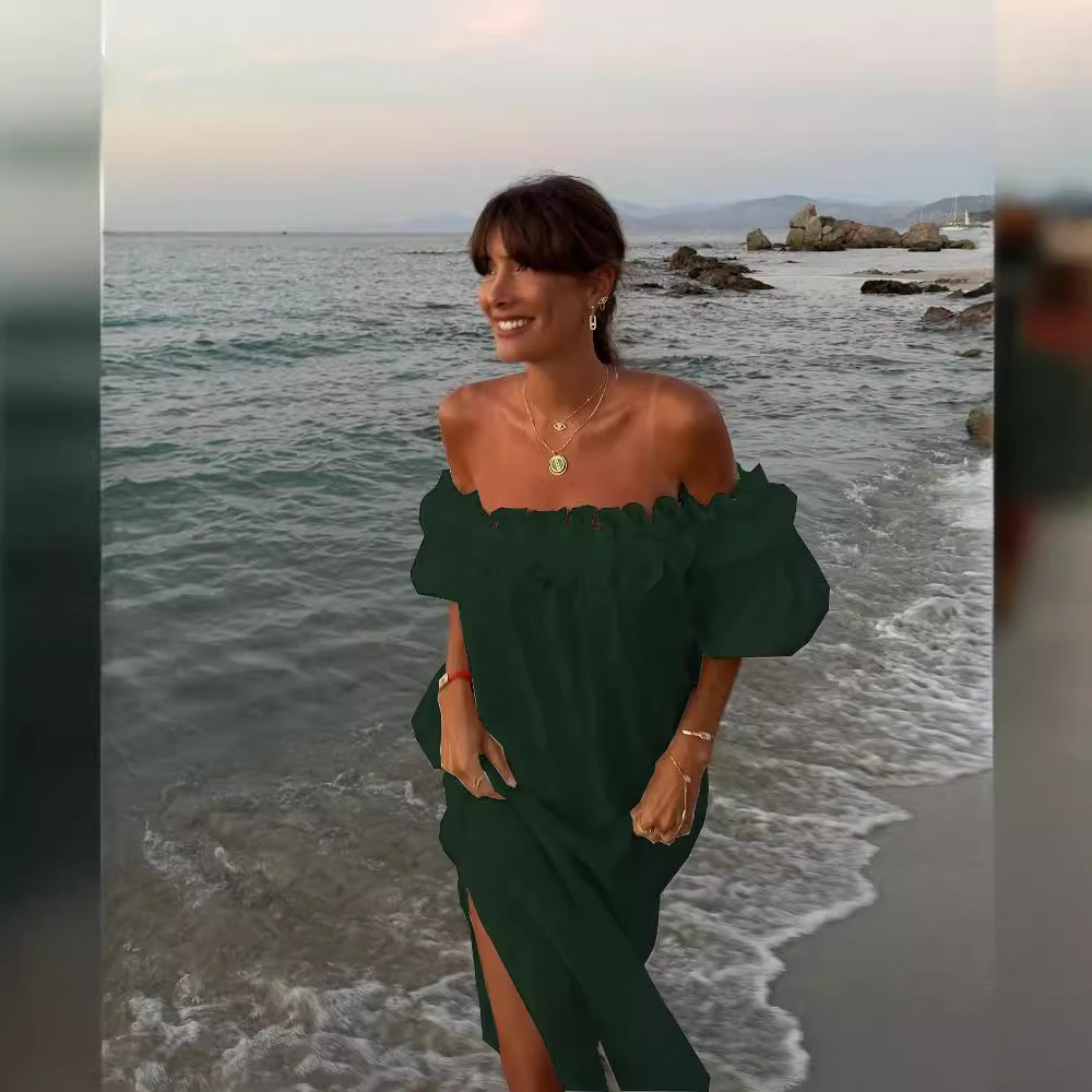 | nameOriginal | Cross-border independent station Amazon new European and American solid color cotton and linen sexy one-word collar split holiday dress for women |