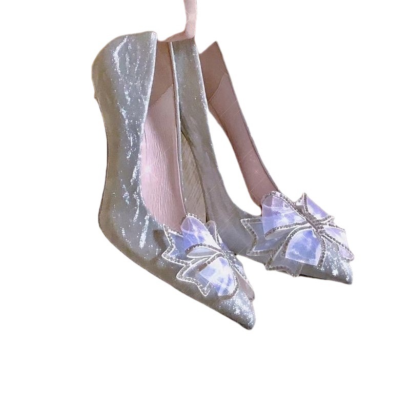 Cross-border Japanese Style Crystal Shoes 2023 Spring & Fall New Silver Wedding Shoes Rhinestone Bow Pointed Toe High Heels Women's Stiletto Heels