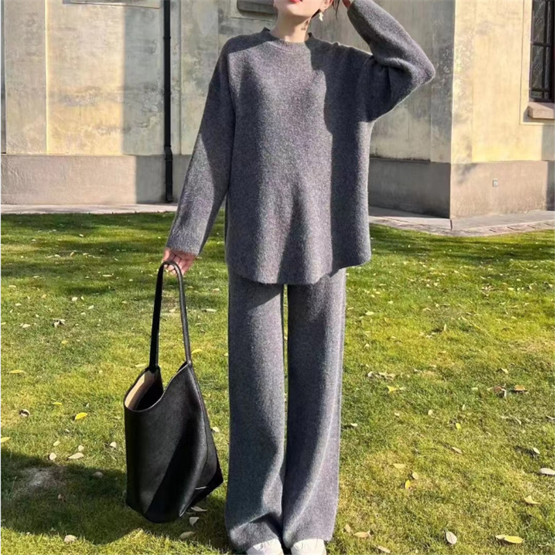 Cross-border knitted suit women's autumn and winter New Fashion casual lazy style loose pullover sweater wide leg pants two-piece set