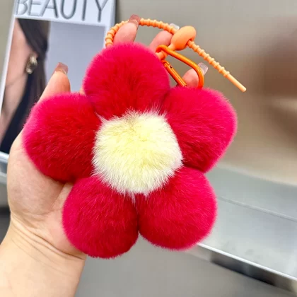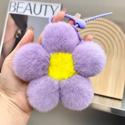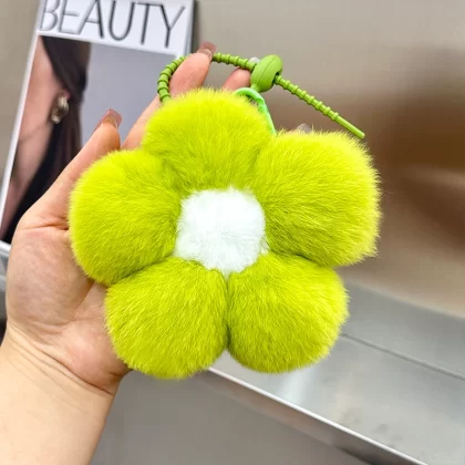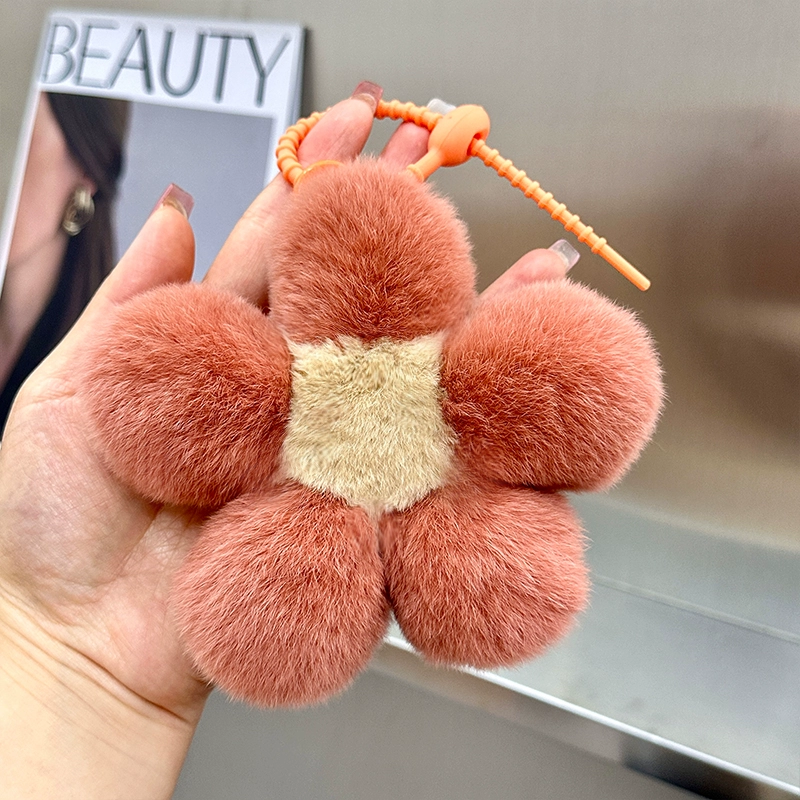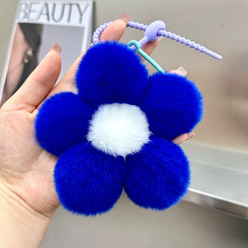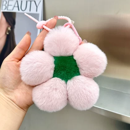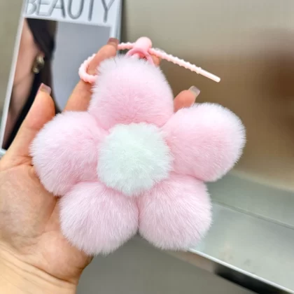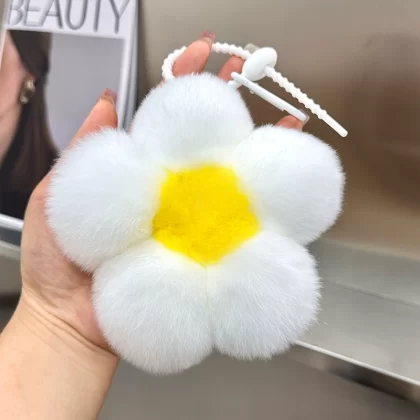 قلادة سلسلة مفاتيح على شكل زهرة لطيفة من فراء أرنب ريكس الحقيقي