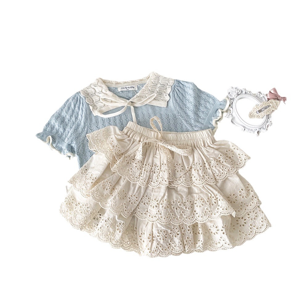 Cutemil spring and summer ins baby girl pullover lapel sweater baby thin hollow color contrast cute knitted short sleeve