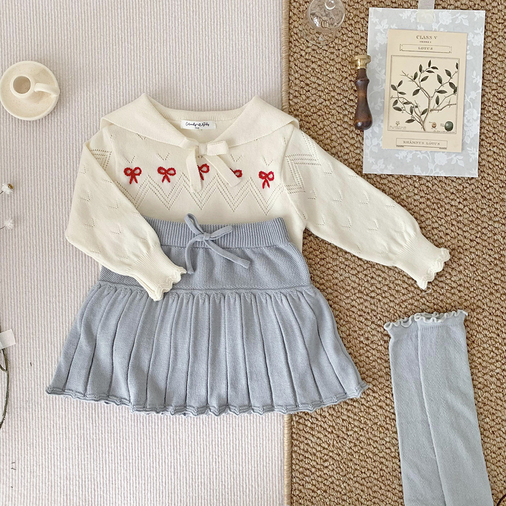 | nameOriginal | Cutemily spring baby girl pullover hollow top baby girl navy collar embroidered college style long sleeve thin sweater |