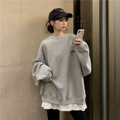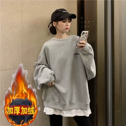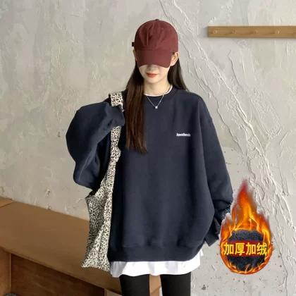 | nameOriginal | Dark sapphire blue fake two-piece sweatshirt for women autumn and winter 2024 new popular oversize loose velvet thickened jacket |