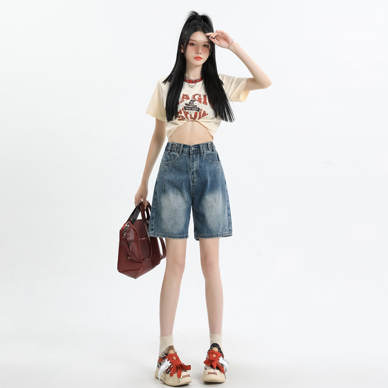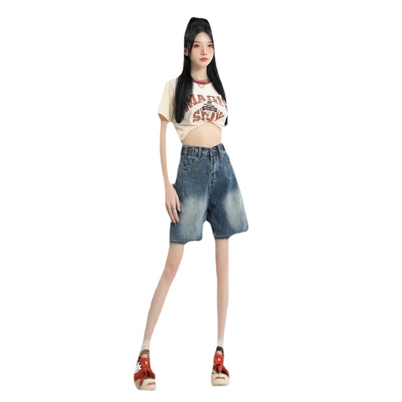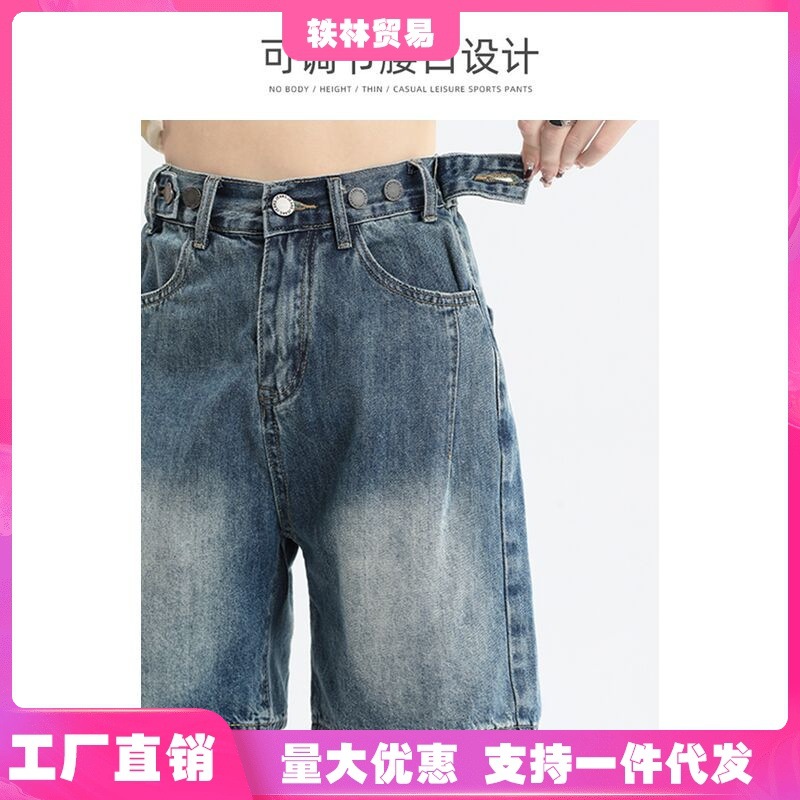 Denim Shorts Women's Summer All-match Simple Adjustable Waist Design Loose Wide-leg Sugar Retro Blue Pants