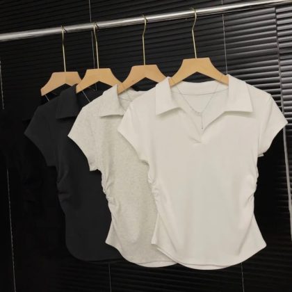 | nameOriginal | Design-Sense Polo Collar Waisted Pleated Top Women's 2024 Summer Simple Slim-Fit Slimming Short-Sleeved Sweet and Spicy T-Shirt |