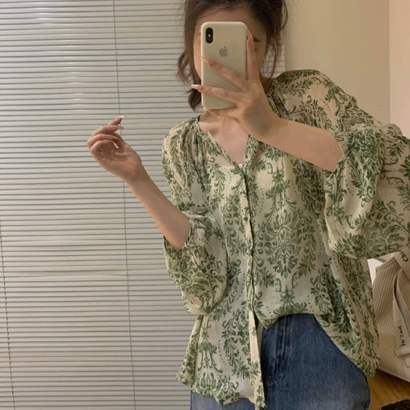 | nameOriginal | Designed retro loose slim green floral lantern sleeve slightly see-through chiffon shirt summer new sun protection shirt for women |