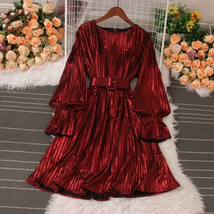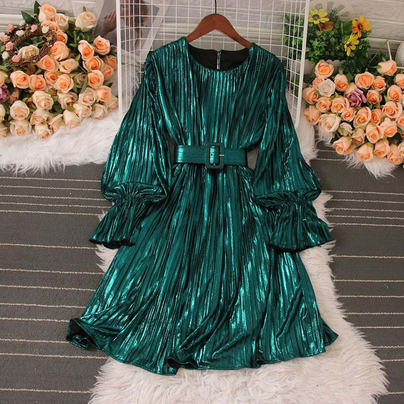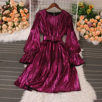 | nameOriginal | Designed round neck waist slimming pleated dress spring and autumn new fashion metallic long-sleeved dress short skirt |