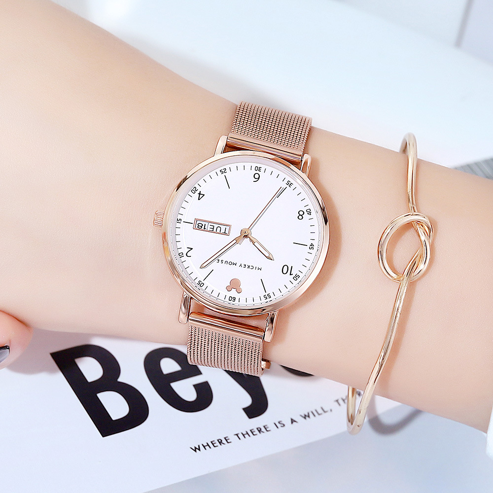 Disney Watch Double Calendar Korean Fashion Trend Large Dial Quartz Watch Student Mesh Band Women's Watch 209/269