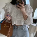 Dongdaemun round neck high waist heavy industry hook pattern hollow shirt