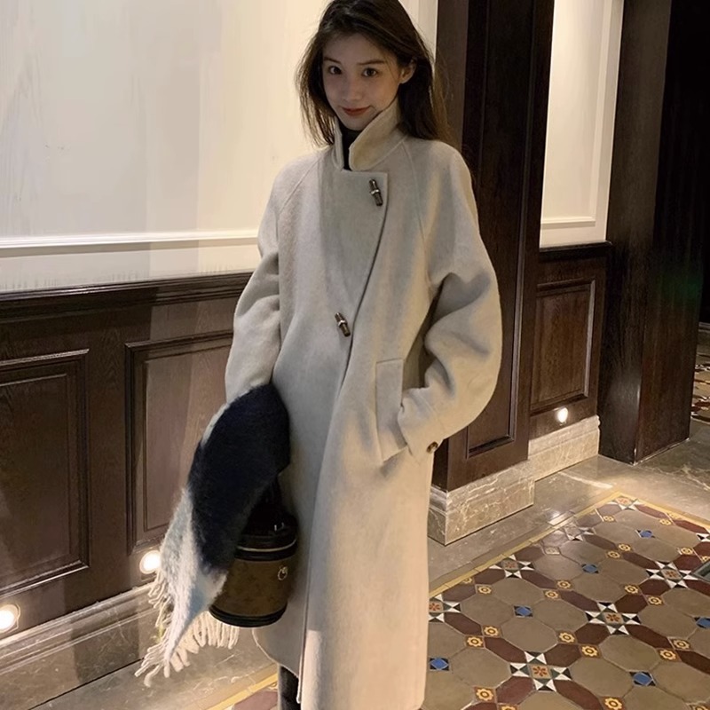 | nameOriginal | Double-sided wool coat long lantern sleeve stand collar horn buckle plush thickened warm cashmere double-sided coat for women |