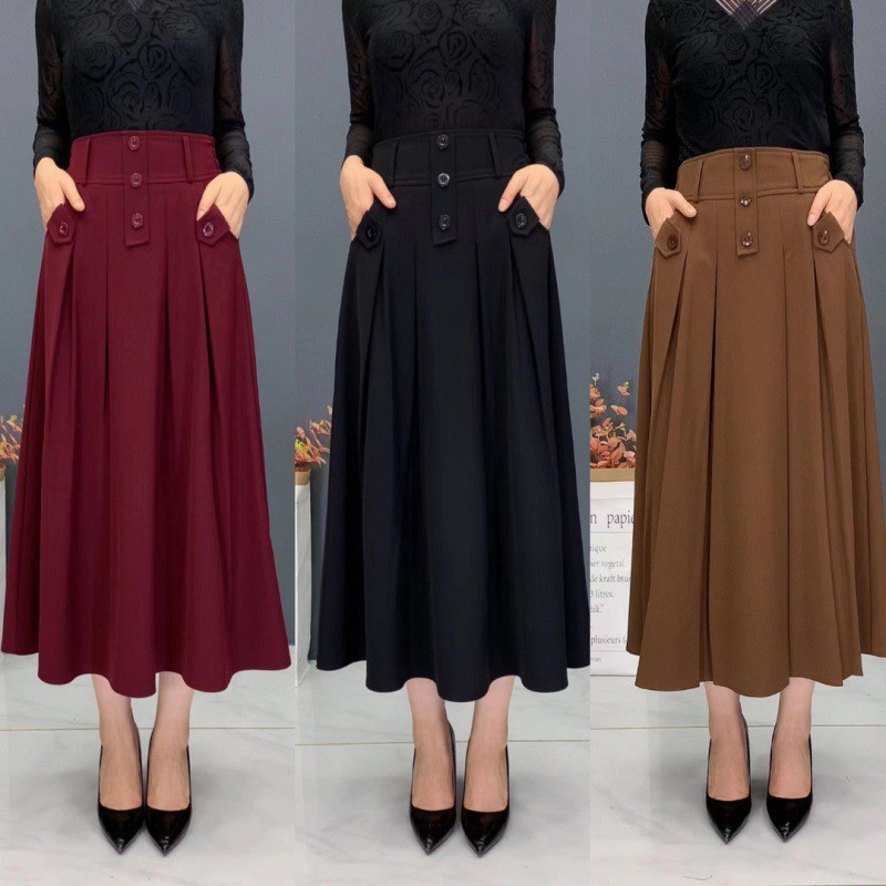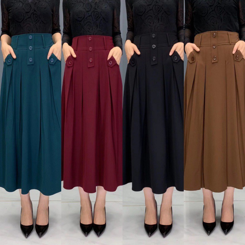 | nameOriginal | Draping skirt for women 2023 spring new fashion elastic waist three-button high waist slimming casual midi skirt |