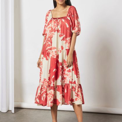يتميز هذا المنتج بمادة بوليستر ناعمة وخفيفة الوزن توفر الراحة. يتميز بتصميم جميل بنقشة الزهور في كل مكان، مع تقويرة مربعة وأكمام قصيرة منفوخة. الحاشية متدرجة ومكشكشة، مما يضيف لمسة أنيقة إلى المظهر العام. للحفاظ على جودتها، يرجى اتباع تعليمات ملصق العناية عند الغسيل. يبلغ طول العارضة التي ترتدي المنتج حوالي 175 سم وترتدي مقاس S.