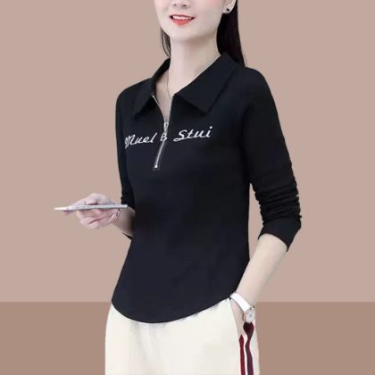 Early Autumn Fashion Zipper POLO Shirt Spring and Autumn New Middle-aged Slim-fit Slimming Solid Color Long Sleeve Sweater Women
