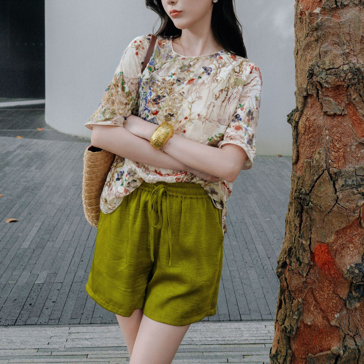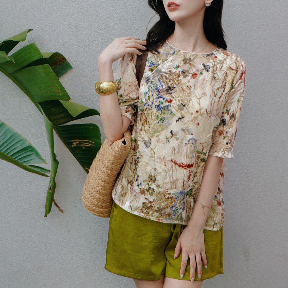 | nameOriginal | Early autumn pavilion pavilion burning flower printed silk velvet top new Chinese style slant button national style temperament shirt for women |