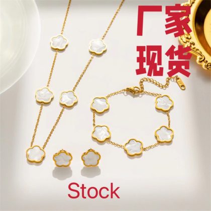 Electroplated 18K non-fading cross-border hot selling stainless steel five-leaf clover suit white fritillary five-leaf flower bracelet three-piece set