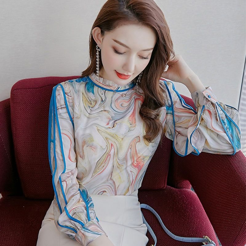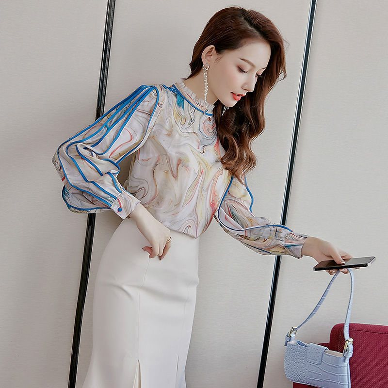 | nameOriginal | Elegant Auricularia Fungus Llace Collar Vintage Shirt Women's Spring and Autumn New Ink Printed Lantern Sleeve Chiffon Shirt All-match Top |