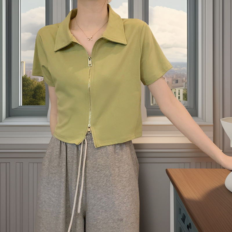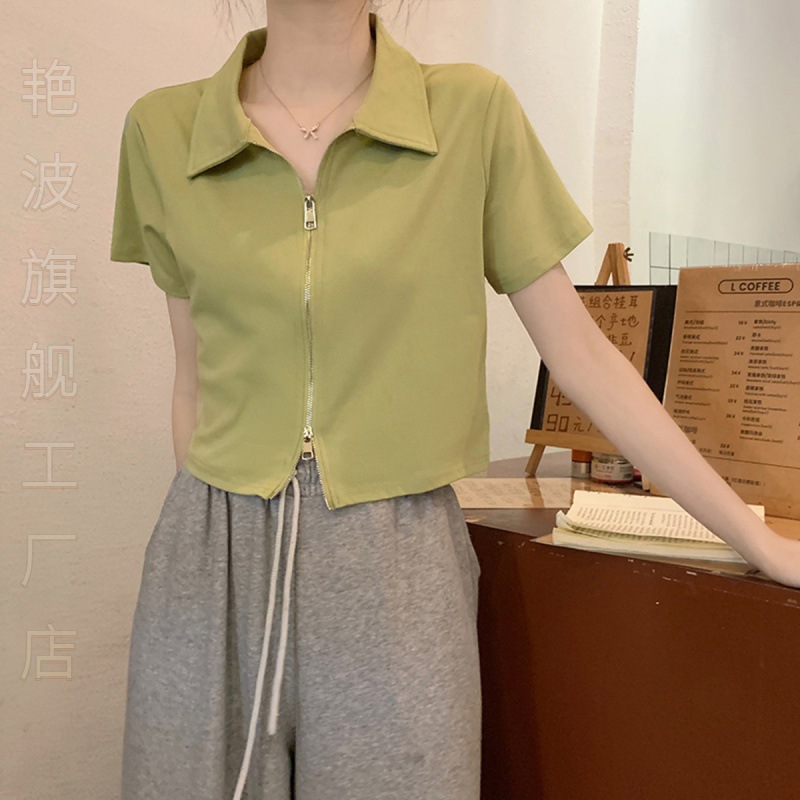 | nameOriginal | Elegant French Style Design Polo Shoulder Short Sleeve T-Shirt Women's 2024 Summer New Style Zipper Half Sleeve Tasty |