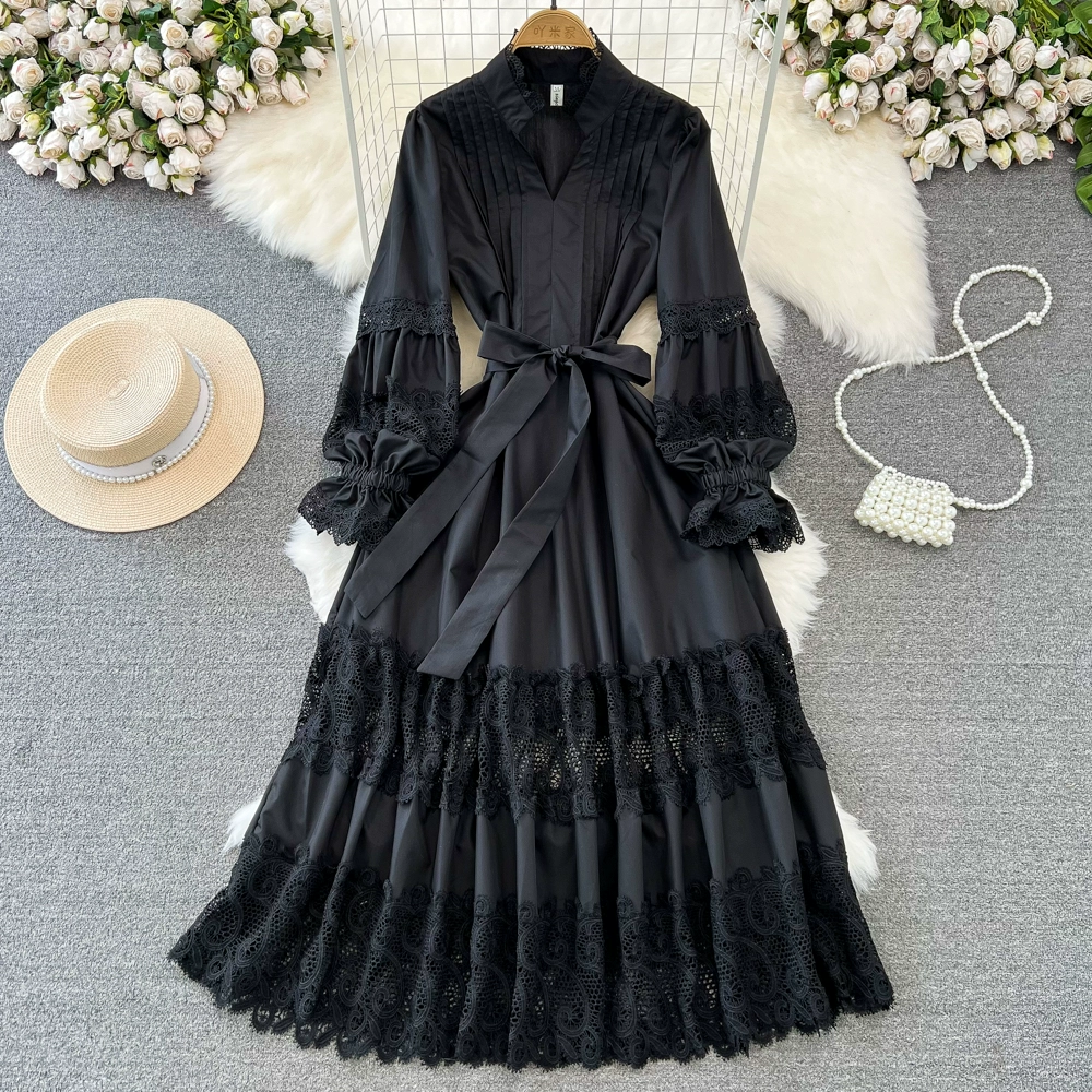 | nameOriginal | Elegant pleated V-neck dress with large lace hem |