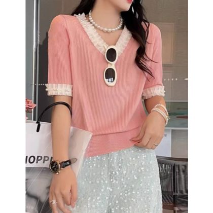 Elegant Slim Sweater Short Sleeve Small Chanel Style Bead Design 2024 New Summer French Top Women's Wear