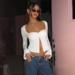 Elegant square collar spring slim fit midriff-baring long-sleeved top