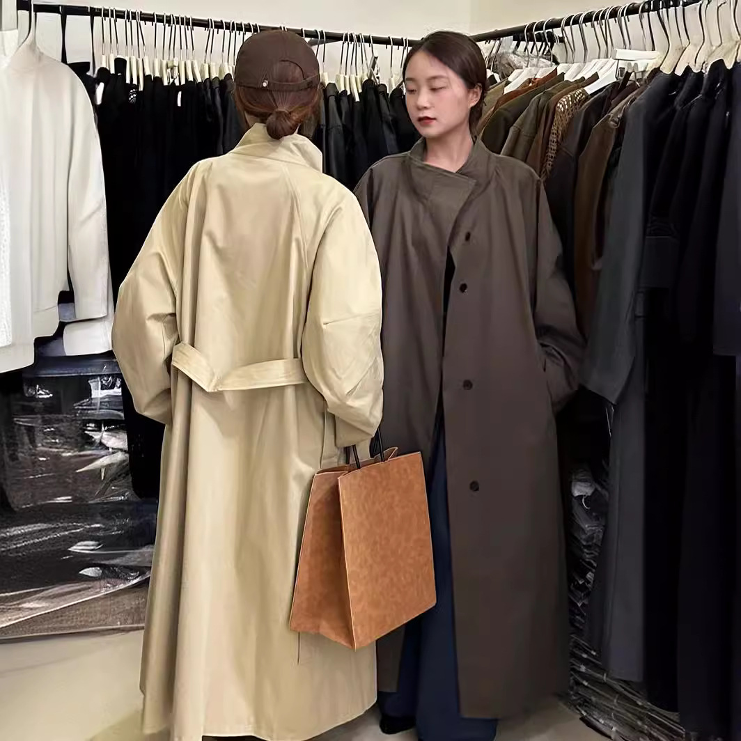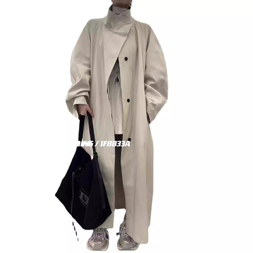 Elegant texture super nice cold style lazy style Gray super long stand collar trench coat for women 2024 spring and autumn hot sale