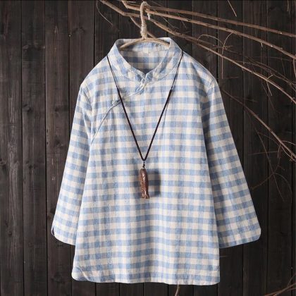 | nameOriginal | Ethnic-style oblique-button plaid top |