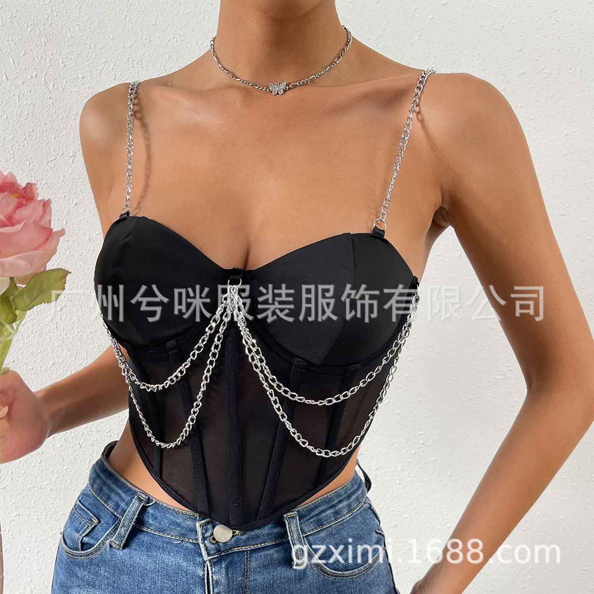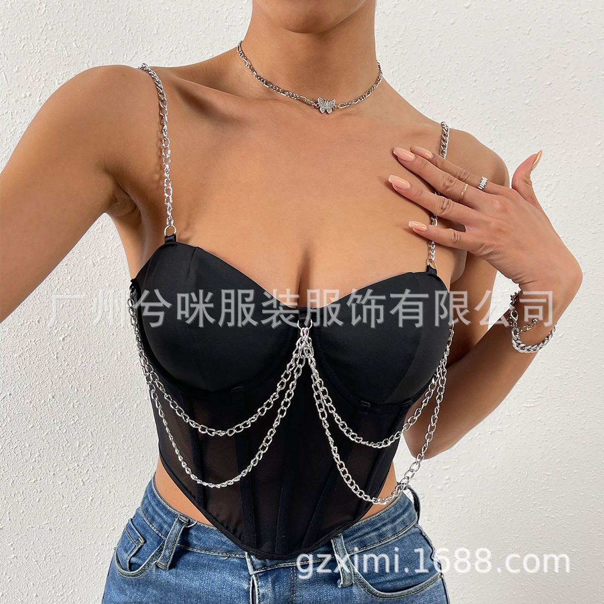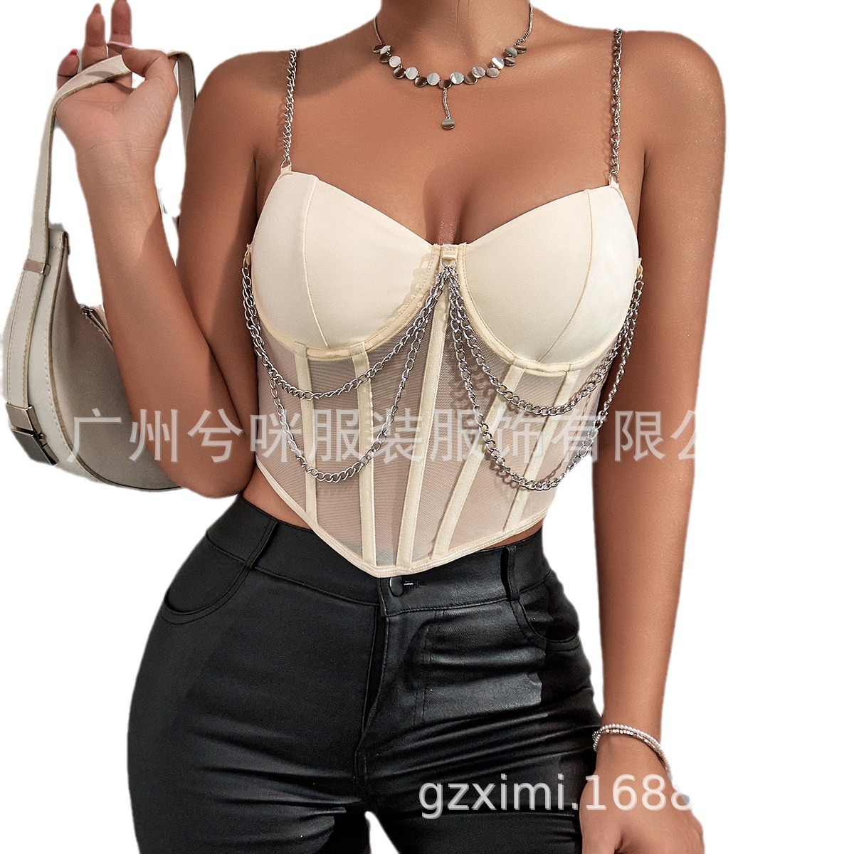 European and American 2023 Summer Street hot girl mesh transparent deep V irregular steel ring Fishbone backless chain sling A986