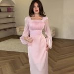 | nameOriginal | European and American Amazon 2024 Cross-border Square Collar Stitching Pleated Silk Sweet Solid Color Horn Sleeve Hip dress |