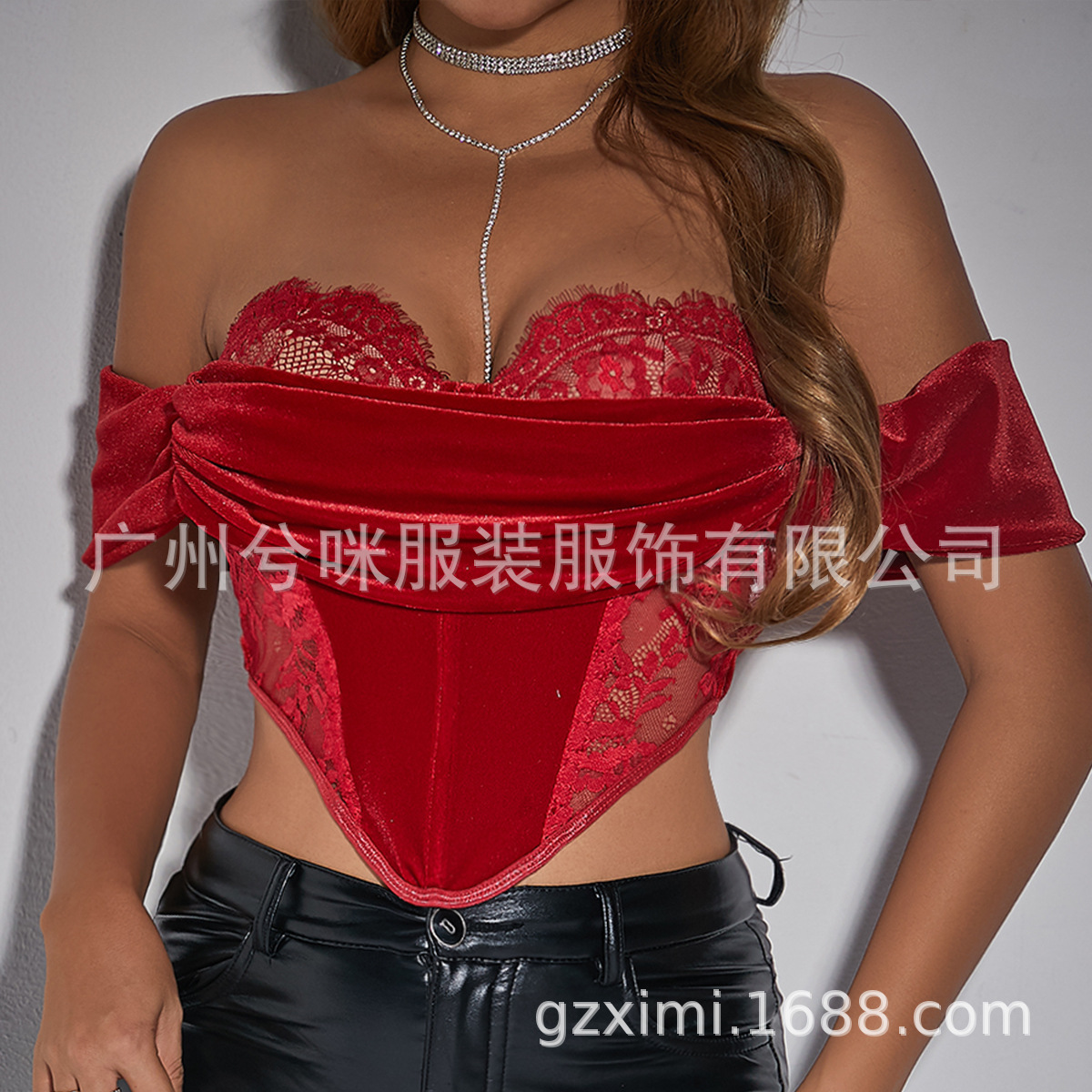 European and American mature style velvet stitching flower lace slim Fishbone steel ring sexy off-shoulder tube top 1237