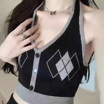 nameOriginal | European and American Spice Girls British Style Diamond Plaid Slim-fit Slim-fit Vest Stitching Contrast Color Sleeveless Knitted Vest for Women |