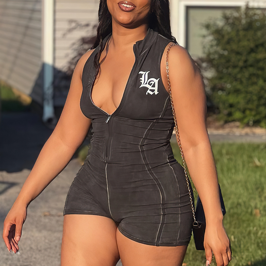 | nameOriginal | European and American women's clothing 2024 spring and summer new stand collar zipper sleeveless stitching sexy tight hip-lifting jumpsuit |